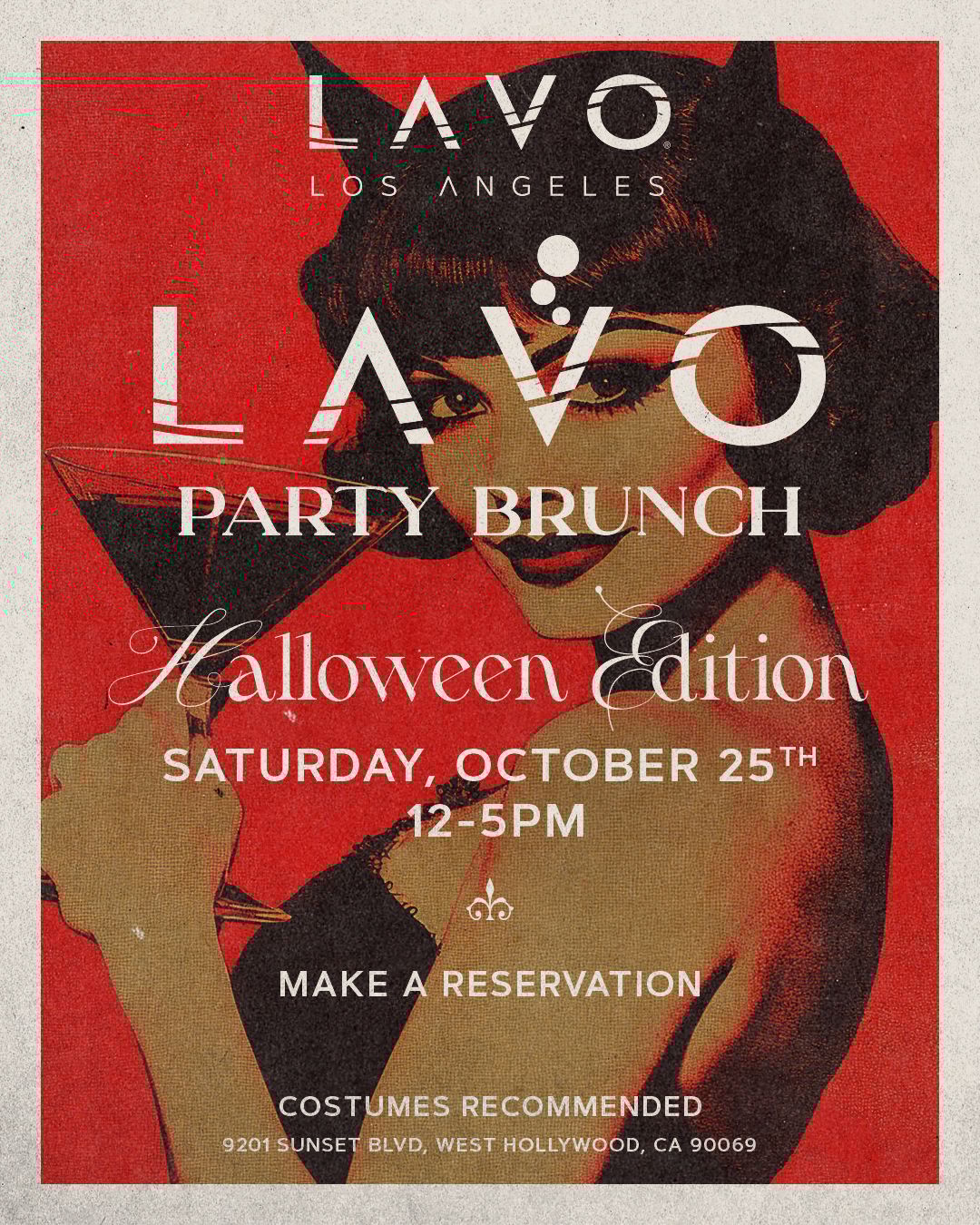 Head to Lavo Los Angeles (9201 Sunset Blvd, West Hollywood, CA 90069) for a thrilling Halloween Party Brunch. From 12 PM to 5 PM, enjoy a festive atmosphere with costumes recommended. Make your reservation now for an unforgettable day! 📍
