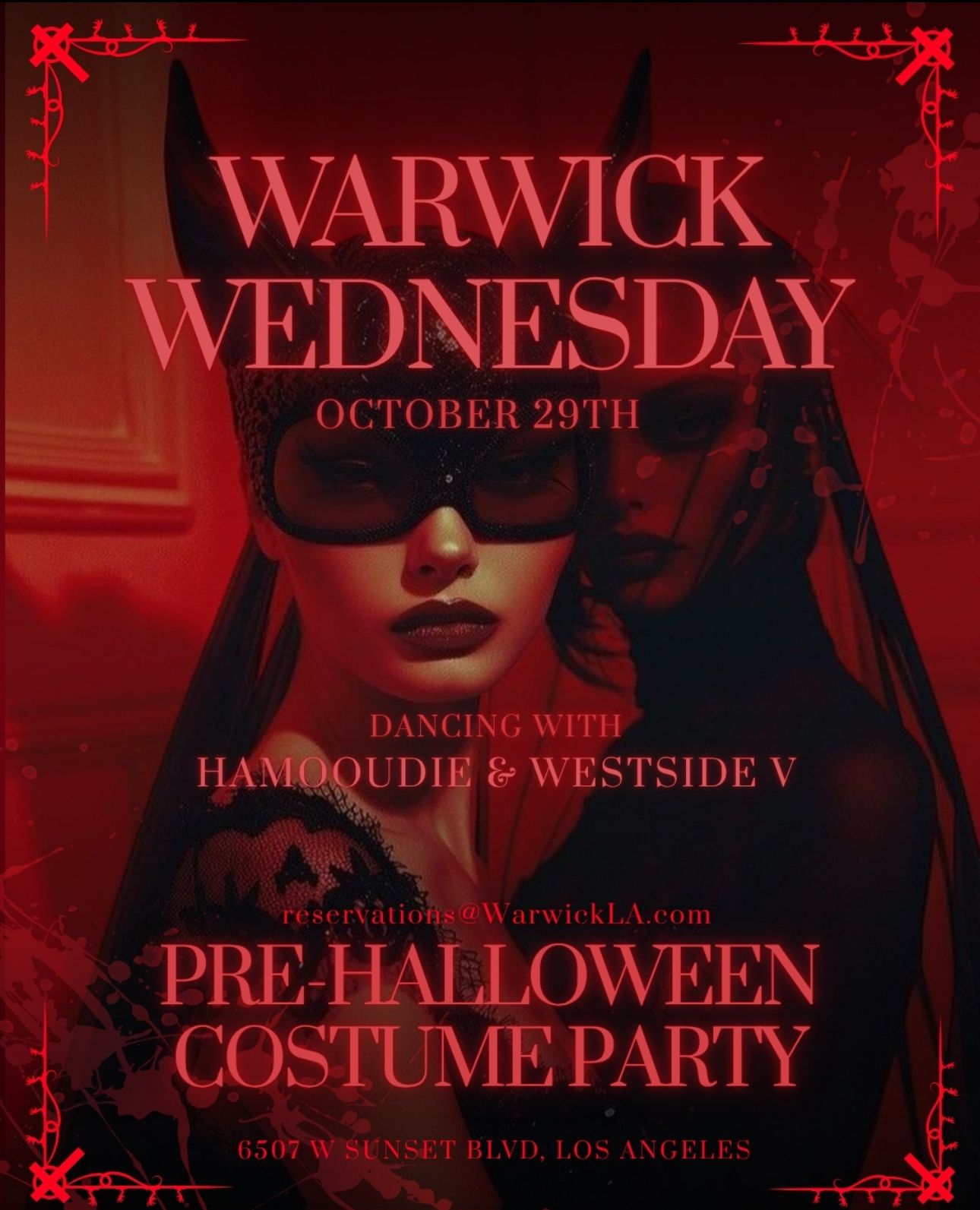 Get into the Halloween spirit at Warwick Nightclub (6507 W Sunset Blvd, Los Angeles) with a Pre-Halloween Costume Party. Featuring dancing with Hamooudie & Westside V, this event starts the spooky season with a bang. Reservations are a must!